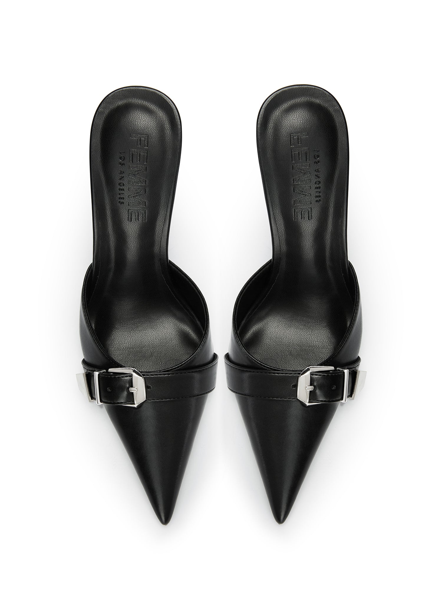 Polished and commanding, the Venetia Mule in Noir is a sharp silhouette defined by a pointed toe, elegant buckle detail, and architectural stiletto heel. This luxury slip-on mule combines vegan leather upper with a leather and rubber outsole for durability and style. Handmade in LA with a self-covered 3.93" stiletto heel, the Venetia delivers sophisticated elegance for the modern woman. Perfect for elevated everyday wear or evening occasions, this pointed-toe mule offers timeless appeal with contemporary design. Closed pointed toe construction and slip-on convenience make it effortlessly chic. Ideal for fashion-forward women seeking sustainable luxury footwear that makes a statement.