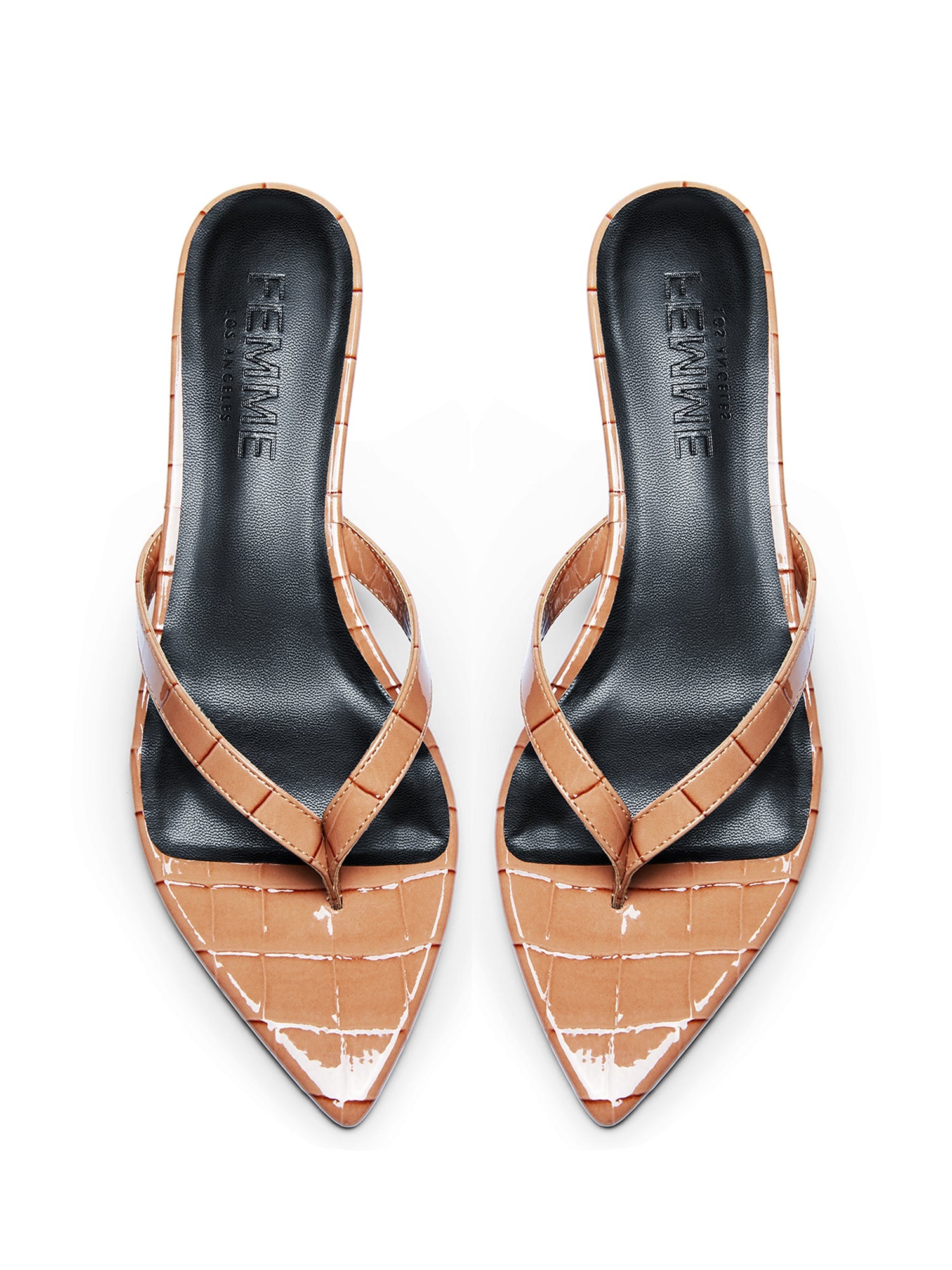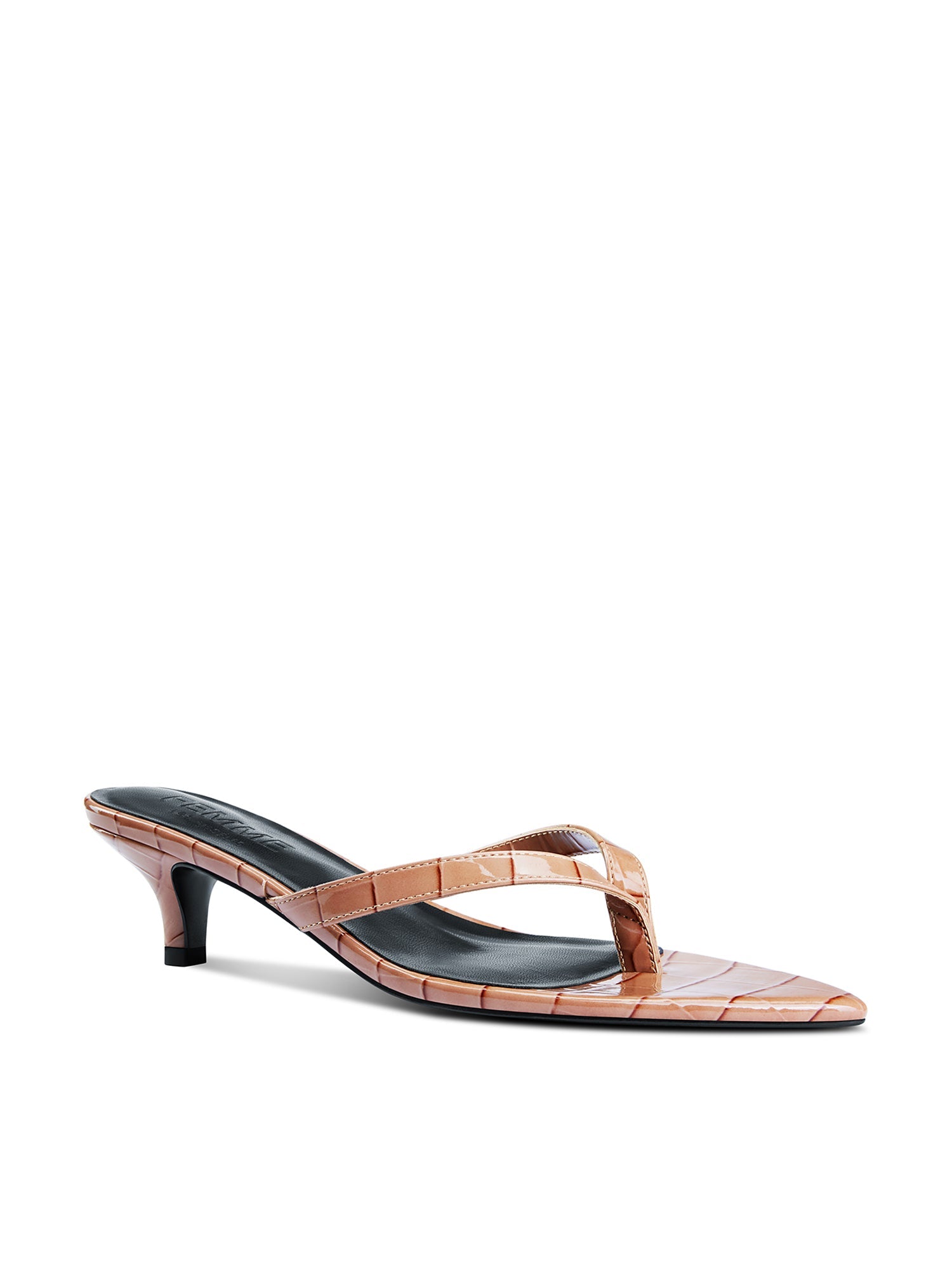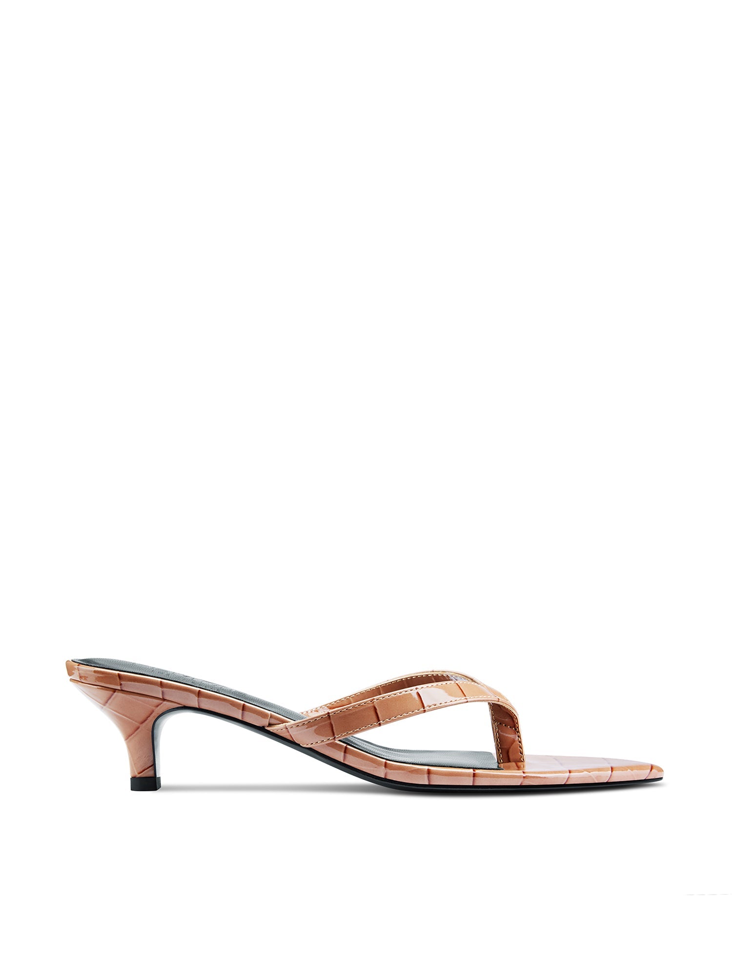The Ginza Thong Slipper features a sleek thong strap design for a modern and chic look. The croc-embossed texture adds a bold and luxurious touch, effortlessly complimenting the kitten heel for maximum comfort and versatility.